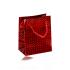 Malá papierová darčeková taštička je vyhotovená v červenej farbe s lesklým trblietavým povrchom, červená šnúrka.
