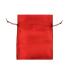 Červené látkové vrecúško na darček, hladký lesklý povrch a trblietavá tmavočervená šnúrka.