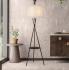 Stojacia lampa Tora s čiernym trojnožkovým rámom a bielym látkovým tienidlom Stojacia lampa Tora je nadčasovo krásny zdroj svetla na použitie v interiéri. Tienidlo v tvare zrezaného kužeľa je vyrobené z bielej látky a obsahuje objímku E27. Čierny rám pozostáva z troch štíhlych nôh a poličky medzi nimi; tá môže slúžiť na umiestnenie dekorácií, ako sú vázy na kvety atď.