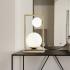 Stolová lampa Buble s kovovým rámom v povrchovej úprave brúseného zlata a dvoma guľovitými tienidlami z opálového skla Stolová lampa Buble s dvoma lampami je vďaka svojmu atraktívnemu dizajnu s ušľachtilým nádychom štýlovou ozdobou obývacích izieb a salónov. Kovový rám pozostáva z plochého štvorcového podstavca a vysokého obdĺžnikového rámu a prezentuje sa v povrchovej úprave brúsené zlato. Na podstavci stojí guľovité tienidlo z opálovo bieleho skla, ďalšie je pripevnené na pravej časti rámu za ním. Do tienidiel možno vložiť po jednej žiarovke G9. Sériu svietidiel Buble navrhol taliansky dizajnér a architekt Davide Negri. Dômyselná súhra asymetrie, rovnováhy, tuhosti a dynamiky dodáva svietidlám jedinečný charakter.