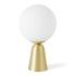 Stolová lampa Lunar s tienidlom z matného skla a mosadznou päticou Na parapete, nocnom stolíku, na príborníku alebo na stole v reštaurácii vyzerá stolová lampa ako harmonický a elegantný doplnok v modernom dizajne. Gulovitá tienidlo na lampu vyrobená z fúkaného mliecneho skla osvetluje miestnost dookola mäkkým svetlom, ktorého jas je možné regulovat stmievacím spínacom na kábli. Kónický kovový podstavec v matnej mosadznej povrchovej úprave završuje stolovú lampu ako ušlachtilý detail.