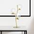 Trojsvetelná stolová lampa Camely s modernou farebnou kombináciou Táto stolová lampa zo série Camely, ktorú navrhol taliansky architekt a dizajnér Davide Negri, je štýlovým zdrojom svetla do obývacích izieb a spální. Kovová konštrukcia s okrúhlym, veľmi plochým podstavcom a krátkymi ramenami, na ktorých sú upevnené tri tienidlá, má vzhľad brúseného zlata. Guľovité tienidlá z borosilikátového skla sú rozdelené na číry vonkajší plášť a pieskovaný vnútorný valec. Ten uzatvára používaný svetelný zdroj G9. Jas možno regulovať pomocou integrovaného stmievacieho spínača na kábli, ak sú zvolené stmievateľné svetelné zdroje.