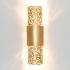 Nástenné svietidlo Palazzo vyrobené zo zlatého železa Nástenné svietidlo Palazzo vyžaruje teplé svetlo a ušlachtilý rozdiel. Je to jemný zdroj svetla pre nábytok z tmavého dreva, terakotu a oázy, aby sa cítili dobre v orientálnom alebo boho štýle. Podlhovastá nástenná lampa distribuuje svetlo vertikálne po zlatej železnej konštrukcii s filigránovými vybraniami. Umelecké stvárnenie pripomína roztavený kov, ktorý - podobne ako malé prúdy - sa mnohými spôsobmi rozvetvuje a potom sa opät spája. V strede kompozíciu obklopuje široký zlatý prsten. Vdaka tomu je lampa pripevnená k stene a môže byt tiež inštalovaná napriec.