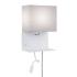 Nástenné svietidlo Merani - ideálne sa hodí ako lampa na cítanie vdaka pružnému ramenu a policke Nástenné svietidlo Merani je praktický spolocník, ktorý je predurcený na použitie v spálni. Je vybavený polickou z bieleho lakovaného kovu, ktorá nahrádza nocný stolík a hodí sa do miestnosti, aby šetrila miesto. K úložnému zariadeniu je pripevnené flexibilné rameno, ktoré je opatrené permanentne nainštalovaným 2,5 W LED svetelným zdrojom a poskytuje 120 lúmenov v teplom bielom svetle. LED svetelný zdroj má uhol lúca 23 ° a je ho možné podla potreby vyrovnat, aby sa dosiahlo optimálne osvetlenie pri cítaní vo vecerných hodinách. Ako další doplnok je na boku police integrovaný port USB, ktorý zaistuje pohodlné nabíjanie smartfónu cez noc. Na nástennom držiaku sú tiež dva spínace, pomocou ktorých je možné samostatne prepínat svetelný zdroj E27 alebo LED diódy vo flexibilnom ramene. Žiarovka E27 je obklopená štvorcovým látkovým tienidlom, ktoré je otvorené zhora a zdola. Poskytuje nepriame svetlo bez oslnenia, ktoré zútulnuje okolie v útulnej atmosfére. Nástenné svietidlo je vybavené odnímatelným textilným káblom so zástrckou, takže na pripojenie stací zásuvka.