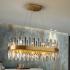 Závesné svietidlo Grace v oválnom tvare s trblietavými sklenenými tyčami Závesné svietidlo Grace v oválnom tvare pozostáva z oválu z brúseného kovu so zlatou povrchovou úpravou, na ktorom je smerom nahor a nadol rozmiestnených 20 objímok G9. Číre, skosené sklenené tyče boli posunuté po celom ovale smerom nahor aj nadol, aby sa vytvorili rôzne výšky. Tieto sklenené tyče sa vo svetle trblietajú a vďaka odrazom a zrkadleniu vytvárajú v miestnosti jedinečné svetelné efekty. Svietidlo visí na štyroch jemných oceľových lanách z oválneho baldachýnu, ktorý má tiež povrchovú úpravu v zlatej farbe. Grace je svietidlo, ktoré spôsobuje senzáciu nielen v domácnosti, ale je aj prestížnym zariaďovacím predmetom v hoteloch, reštauráciách a iných priestoroch.