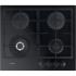 plynová varná doska s povrchom z tvrdeného skla, 4 horáky, 2 liatinové mriežky, integrované zapaľovanie horákov, bezpečnostné ventily horákov, 1x vysokovýkonný 2-korunkový horák, krokové ovládanie multilevel flame, max. výkon horákov: 7,8 kW, ovládanie vpredu, šírka: 59 cm, čierne ovládače