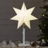 Hviezdne diamanty béžovej farby na bielom drevenom podklade Sedemcípa papierová hviezda Karo sedí na tróne na kovovom ráme a je vybavená obdlžnikovým dreveným podstavcom. Karo svojou mäkkou žiarou šíri útulnú atmosféru. Rýchlo umiestnená dekorácia na komody, stoly, police a parapety. Do rámu je integrovaná pätica E14, v ktorej je možné použit všetky typy svetelných zdrojov s päticami E14. Zodpovedajúce žiarovky je možné dokúpit pomocou príslušenstva. Vybavený vypínacom na kábli.