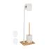 Toaletná kefa s držiakom na toaletný papierS týmto štýlovým toaletným komorníkom budete mať toaletný papier a toaletnú kefu vždy po ruke. Či už v kúpeľni alebo na toalete pre hostí, voľne stojacu toaletnú súpravu je možné umiestniť flexibilne a nemusí byť pripevnená k stene. Dekoratívne prevedenie WC stojana z prírodného bambusu a bielej nerezovej ocele sa hodí do každej kúpeľne. Vymeniteľná hlavica kefky a 2 náhradné WC kefy zaisťujú potrebnú hygienu.Stojanový držiak na toaletný papier s toaletnou kefouPraktická kombinácia držiaka papiera a štetcaHygienicky vymeniteľná hlavica kefky - Obsahuje náhradné hlaviceStabilný stojan vďaka základnej doske s chráničmi podlahyVyrobené z prírodného bambusu a robustnej nehrdzavejúcej ocele v bielej farbeJednoduchý dizajn je ideálny do kúpeľne alebo hosťovskej toaletyToaletná zostava v detaileVeľkosť V x Š x H: cca 70,5 x 22 x 18 cmHmotnosť: cca 0,8 kgMateriál: nehrdzavejúca oceľ, bambus, PPFarba: biela, prírodnáDetailné rozmery WC setuDržiak na toaletnú kefu V x Š x H: cca 13 x 9 x 9 cmDĺžka WC kefy: cca 34,5 cmHlava kefy V x H: cca 9,5 x 8 cmVnútorný závit D: cca 1 cmHĺbka držiaka toaletného papiera: cca 13 cmrozsah doručenia1x WC set v jednotlivých častiach2x náhradná hlavica kefkyS montážnym materiálomilustrované pokynybez dekorácieMateriálové zloženie60% nehrdzavejúca oceľ30% bambus10% plastuRD 10049119_0